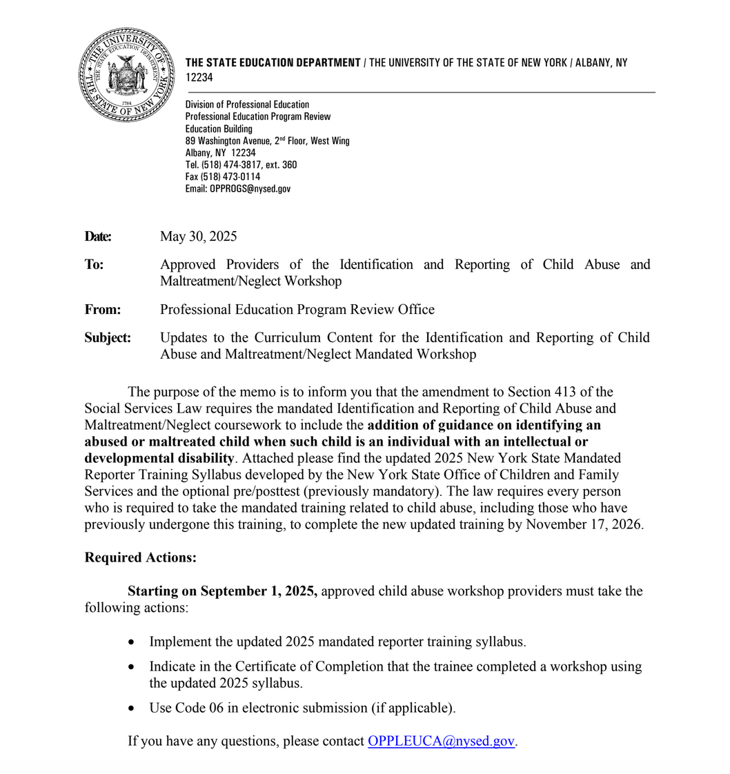 Mandatory Re-training for NYS Mandated Reporters by 2026